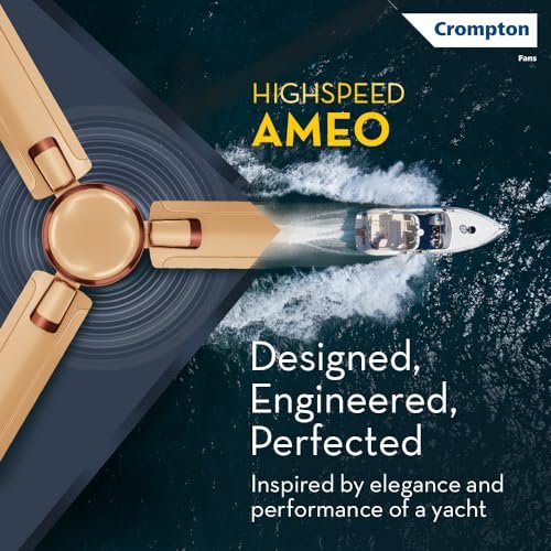 Feature | Product : CROMPTON HIGHSPEED AMEO Technical Specifications : Sweep Size 1200 mm;Speed 365 RPM MOTOR; Air Delivery 215 CMM;Input Power 53 W POWER; Regulator |