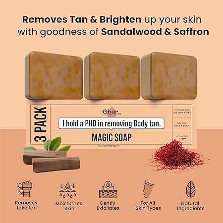 Indulge your skin in the luxurious goodness of Ghar Soaps Sandalwood & Saffron Magic Soap, a premium blend crafted to bring traditional beauty secrets into your everyday routine. Infused with pure sandalwood and precious saffron, this soap delivers a soothing, aromatic bathing experience while nourishing your skin deeply from within.