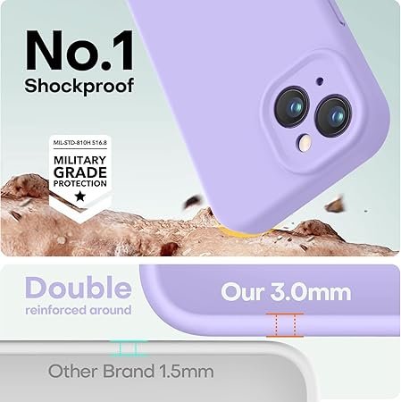 Soft Liquid Silicone Case for iPhone 15 in elegant Purple, featuring a slim design, shockproof protection, anti-scratch microfiber inner lining, and precise cutouts. Lightweight, durable, and perfect for daily use.