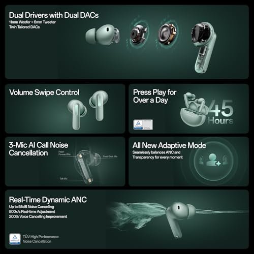 About this item [Industry leading ANC up to 55 dB & 5500Hz range]: Powered by the latest OnePlus algorithms, Buds 4 can dynamically adjust ANC in real time—up to 800 times per second—based on ambient noise to ensure optimal noise cancellation. [All-New Adaptive Mode] Dynamically switches between ANC and Transparency Modes for safer and smoother listening. [Flagship level near-lossless sound]: Featuring twin tailored DACs (Digital-to-Analog Converter), an 11mm woofer and a 6mm tweeter, precisely engineered to deliver powerful bass and clear treble, creating rich lows and pristine highs across a wide soundstage. Industry leading Hi-res Codec of LHDC 5.0 and upto 1 Mbps 24-bit 192kHz LHDC 5.0 meets studio-grade Hi-Res for silky-smooth sound with reduced latency. [Steady Connect | AI translation] Steady connect ensures reliable connectivity both indoors & outdoors. It ensures ultra strong bluetooth with massively extended range up to 250 meters(For select OnePlus phones with Oxygen OS15.0.0 & above). With AI translation, break the language barrier. Experience seamless real-time conversation in many languages. [IP55 Rating]: With IP55 dust and water resistance, you’re protected against sweat and rain—no worries, just music. [Customizable settings for hassle free control]: Slide up/down for volume control, Long touch/hold to switch among ANC, adaptive & transparency mode, single tap for play/pause,double or triple taps for switching songs. [47ms low latency in game mode]: Low latency ensures every gunshot, footstep, and game alert syncs perfectly with your actions, providing users with a smoother and more enjoyable gaming experience. [Fast charing & longer battery life]: Large battery delivers up to 45 hours of non-stop music with ANC Off; A quick 10-minute charge delivers up to 11 hours of music playback. [Dual-Device Connection | BT5.4 | Google Fast Pair ]: Simultaneously connect to two devices (Android/iOS/Windows smartphones, tablets or computers) for quick and seamless device switching, Google fast pair simplifies the pairing process, Voice assistant shortcut (Google Gemini, Google Assistant or Apple Siri) to help you with various tasks.