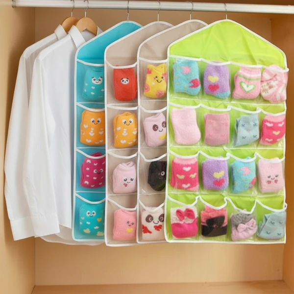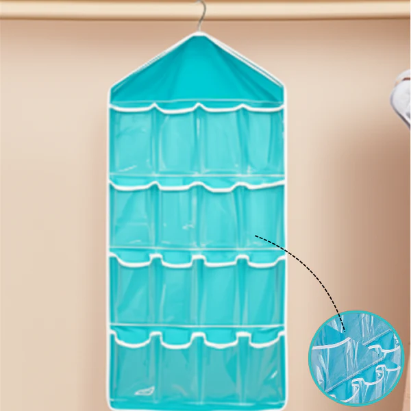 Premium 16 Pocket Hanging Wardrobe Organizer with durable fabric and strong hook. Perfect for organizing clothes, accessories, and daily essentials while saving space.
